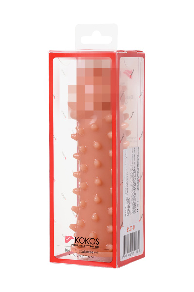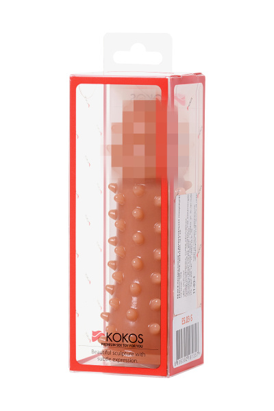Увеличивающая насадка с фантазийным рельефом в виде пупырышек от KOKOS открывает новые возможности для взаимного удовольствия и воплощает фантазии о внушительном размере пениса. Увеличенный размер и объем полового члена добавляет мужчине уверенности в своих сексуальных возможностях. Дополнительная стимуляция партнерши для яркого и насыщенного оргазма. Увеличение продолжительности полового акта у мужчины - задержка эякуляции, и наращивание темпа приближения оргазма у женщины. Реалистичная насадка на пенис - необходимый элемент для вашей сексуальной игры, если вы хотите максимально удовлетворить свою партнершу и сделать ваш секс незабываемым. Насадка придает дополнительный объем и длину половому члену. Мощная головка имеет крупный выступ и очень хорошо стимулирует зону G и вход во влагалище благодаря значительному размеру. Особенный рельеф в виде мягких шипов по всему стволу насадки деликатно ласкает чувствительные зоны. Дополнительный объем дарит то самое чувство наполненности, увеличивая поток возбуждения. Мужчина тоже будет ощущать стимуляцию за счет давления стенок влагалища на пенис. Для идеальной посадки по длине пениса используйте губчатую вставку, которая находится внутри насадки, подрезав ее до нужной длины. Не забудьте надеть презерватив в этом случае. В основании есть отверстие для мошонки, с помощью которого вы можете надежно зафиксировать насадку на пенисе и не ограничивать себя в активных движениях. Супер эластичный и нежный материал быстро принимает температуру тела, отлично тянется, сохраняя при этом прочность. Долговечность использования при соблюдении правил хранения и ухода за насадкой.  Насадка сделана из высококачественного безвредного для человеческого организма материала, который прошел необходимые тестирования и сертификацию. Размер: L . Рекомендуем использовать до и после применения - дезинфицирующее средство для игрушки. Чтобы обеспечить длительное скольжение и комфорт интимных отношений, рекомендуем использовать смазку на водной основе. Хранить при температуре не выше 35 градусов, избегать попадания прямых солнечных лучей. Перед хранением необходимо хорошо просушить
