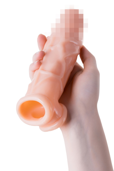 Увеличивающая насадка с фантазийным рельефом в виде вен и пупырышек от KOKOS открывает новые возможности для взаимного удовольствия и воплощает фантазии о внушительном размере пениса. Увеличенный размер и объем полового члена добавляет мужчине уверенности в своих сексуальных возможностях. Дополнительная стимуляция партнерши для яркого и насыщенного оргазма. Увеличение продолжительности полового акта у мужчины - задержка эякуляции, и наращивание темпа приближения оргазма у женщины. Реалистичная насадка на пенис - необходимый элемент для вашей сексуальной игры, если вы хотите максимально удовлетворить свою партнершу и сделать ваш секс незабываемым. Насадка придает дополнительный объем и длину половому члену. Мощная головка имеет рельеф из мелких пузырьков и крупный выступ. Очень хорошо стимулирует зону G и вход во влагалище благодаря значительному размеру. Особенный рельеф в виде многочисленных вен по всему стволу насадки деликатно ласкает чувствительные зоны. Дополнительный объем дарит то самое чувство наполненности, увеличивая поток возбуждения. Мужчина тоже будет ощущать стимуляцию за счет давления стенок влагалища на пенис. Для идеальной посадки по длине пениса используйте губчатую вставку, которая находится внутри насадки, подрезав ее до нужной длины. Не забудьте надеть презерватив в этом случае. В основании есть отверстие для мошонки, с помощью которого вы можете надежно зафиксировать насадку на пенисе и не ограничивать себя в активных движениях. Супер эластичный и нежный материал быстро принимает температуру тела, отлично тянется, сохраняя при этом прочность. Долговечность использования при соблюдении правил хранения и ухода за насадкой. Насадка сделана из высококачественного безвредного для человеческого организма материала, который прошел необходимые тестирования и сертификацию.Рекомендуем использовать до и после применения - дезинфицирующее средство для игрушки, чтобы обеспечить длительное скольжение и комфорт интимных отношений, рекомендуем использовать смазку на водной основе. Для бережного хранения материала пересыпать пудрой для игрушек. Хранить при температуре не выше 35 градусов, избегать попадания прямых солнечных лучей. Перед хранением необходимо хорошо просушить