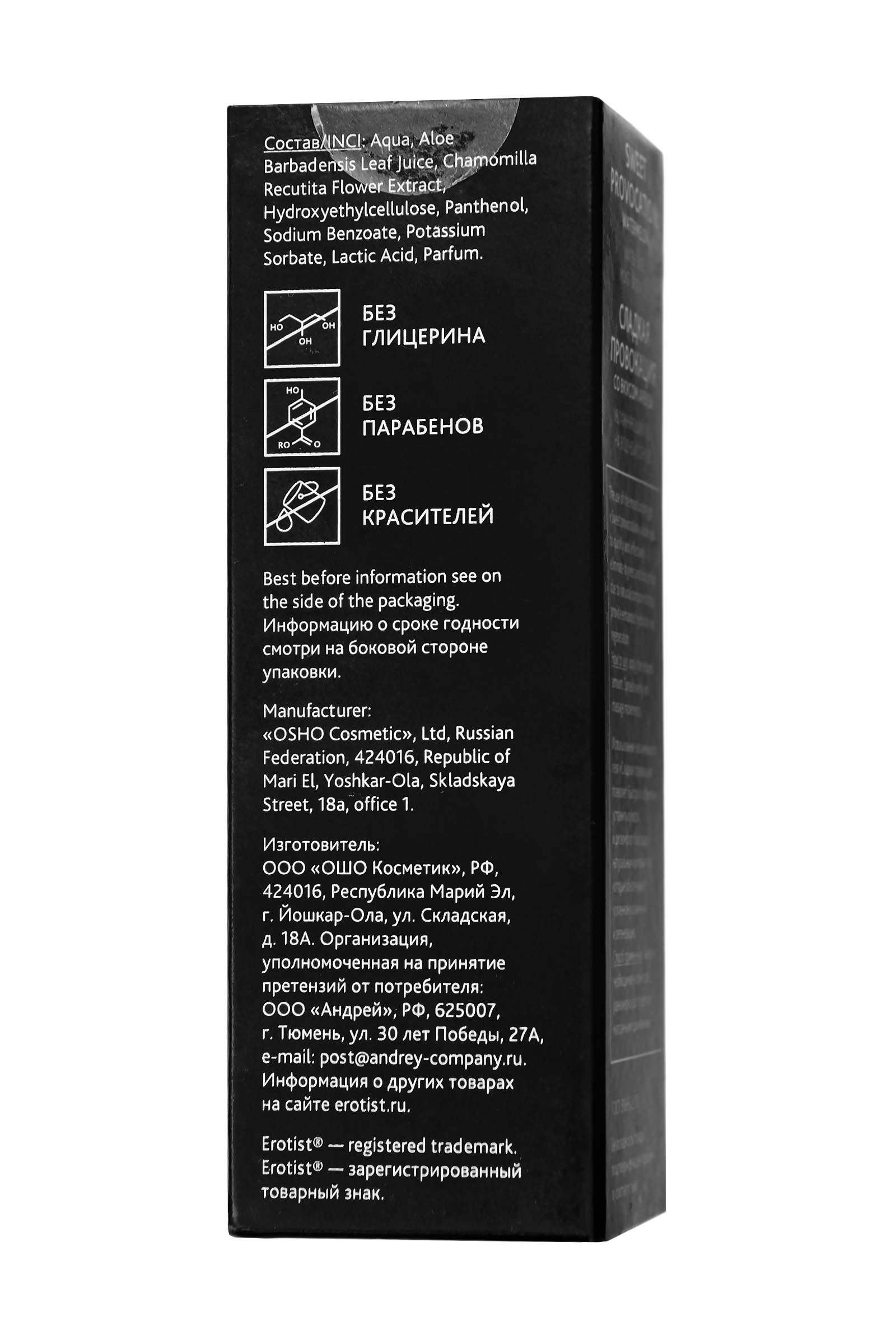 Применение геля-смазки Эротист на водной основе SENSUAL PROVOCATION - это эффективный способ улучшить ощущения при любых видах секса. Гель интенсивно увлажняет, повышает скольжение и предотвращает возникновение трений и микротравм. Благодаря компактному флакону, его легко можно взять с собой и использовать в любой момент, чтобы добавить страсти и непредсказуемости в ваши отношения. С партнером или игрушками, с презервативом или без – этот универсальный интимный гель усилит ваше удовольствие. В состав геля не входит глицерин: компонент, на который, хоть и редко, но всё же бывает реакция в виде раздражения в интимных зонах. Поэтому гель SENSUAL PROVOCATION подходит для самых чувствительных. Действие геля на водной основе Чувственная провокация: • Увлажняет, устраняет сухость и интимный дискомфорт, • Предотвращает зуд, жжение, раздражение, • Поддерживает естественный баланс pH слизистой у женщин, • Способствует регенерации и заживлению микротрещин, • Восполняет недостаток естественной смазки — подходит для любого секса — совместим с любыми игрушками и презервативами — не содержит гдицерин, парабены, масла и отдушки не липнет, не скатывается, легко смывается водой